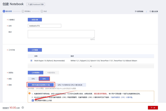 我们可以选择“GPU”中的“[限时免费]体验规格 GPU 版”,并勾选“我已阅读并同意以上内容”,点击“下一步”,“提交”,即可成功创建 notebook 开发环境啦~