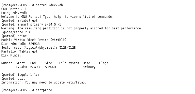 【摘要】 近期有小伙伴被大磁盘做lvm困扰,自己用parted测了一下。测试过程如下以供参考:1、ecs准备2、parted磁盘# parted /dev/vdbmklabel gptmkpart primary ext4 0 -1printtoggle 1 lvmquitpartprobe lvm建立# yum -y install lvm2# pvcreate /dev/vdb1# pvcreat...