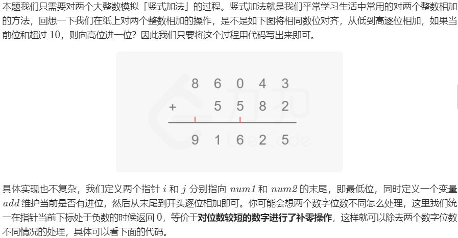 int i = strlen(num1) - 1, j = strlen(num2) - 1, add = 0;