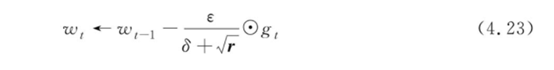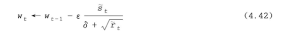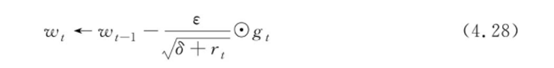 式中,δ和ε的设定都是和AdaGrad一样。采用求平均值而非像AdaGrad那样求和的方式,可以有效地避免学习率无限低问题。RMSProp算法总结如算法4.2所示。