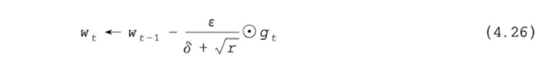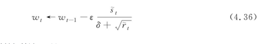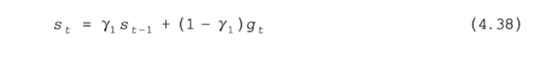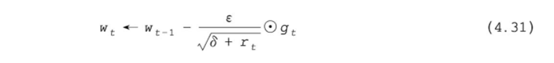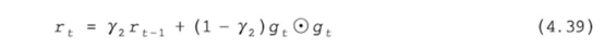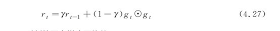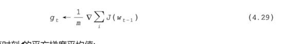 4.4.2 RMSPropAdaGrad的问题就是学习率最终会无限小,为了解决这个问题,RMSProp作为AdaGrad的扩展,提出通过求当前状态下平方梯度的对数平均值来解决上述问题。时刻t的平方梯度平均值定义公式如下: