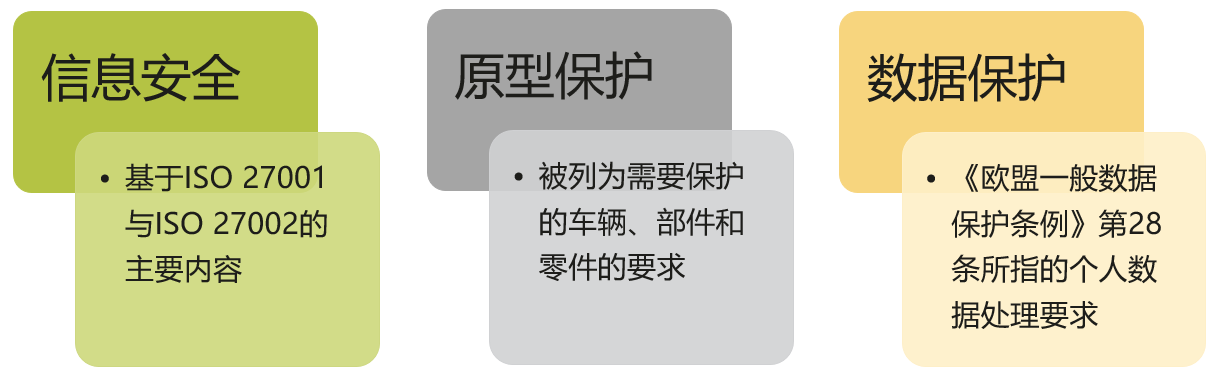 ◆ 原型保护(Prototype Protection):包含车辆原型(试验车、核心零部件样件)保护的物理和组织要求,并适用于组织处理车辆原型的各流程(运输、停放等)