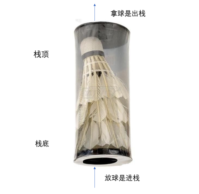 先进后出是什么意思呢?打个比方,你现在有个羽毛球球桶,当你需要打球的时候,通常会在球桶顶端拿球,打完了放回去的时候,却不能放在顶端,只能从底部塞入,再次去拿球的时候,只能从顶部去拿新的球,这就是这就是栈。(下图有误,应该是从哪放就从哪拿)