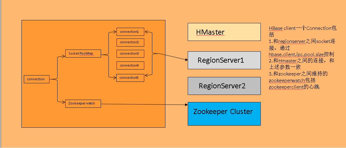 首先我们来看下HBase的API文档当中对Connection的定义是:A cluster connection encapsulating lower level individual connections to actual servers and a connection to zookeeper.,这句话的理解就是和regionserver(包括HMaster)以及zookeeper直间的连接,总结起来就是如下图: