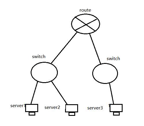 下面图中最上面是路由器,第二层是交换机,最下层是服务器。服务器1和服务器2之间通信走左边的交换机,服务器1和服务器3之间通信需要通过最上层的路由器。