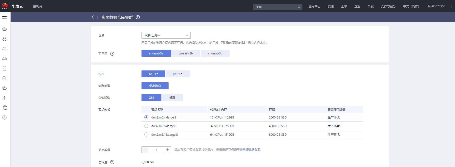 1、进入GaussDB(DWS) 服务 “购买数据仓库集群” 页面。