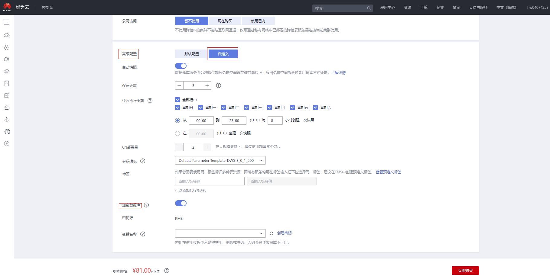 6、创建完成后,选择使用得到的密钥去创建DWS集群。