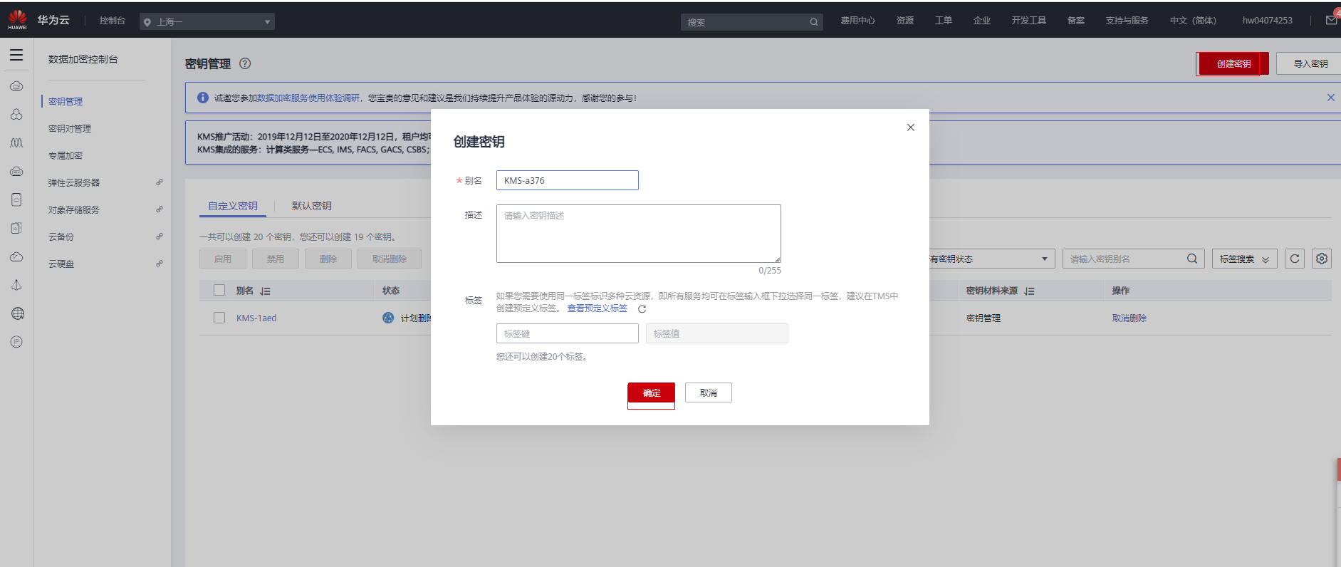 5、在创建密钥的页面中填入别名和描述,点击“确定”按钮,密钥创建完成。