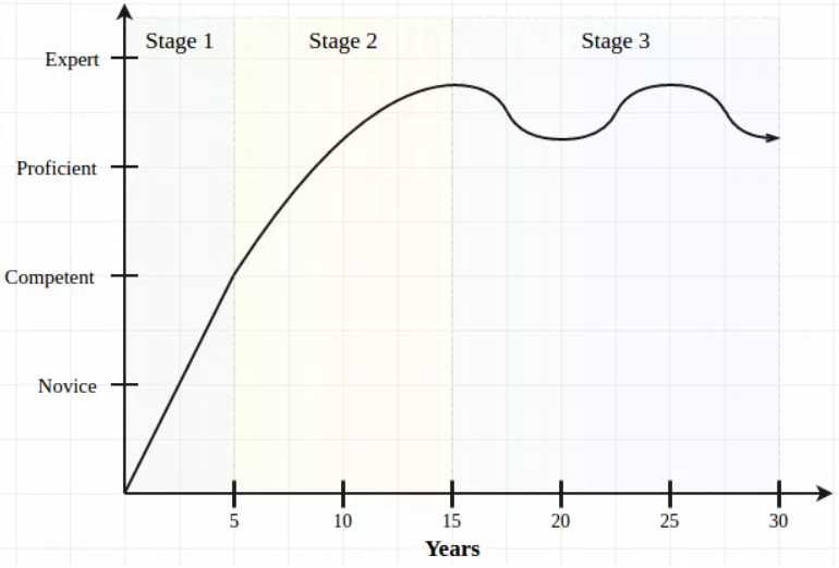 我正处于第三阶段。我还是很喜欢学习,但我明白,不努力的话,我可能会一直保持在“专家”的平衡状态边缘。
