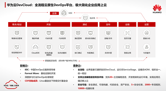 华为云提供云原生DevOps平台:华为云DevCloud软件开发平台。华为云DevCloud在业界具有较高的影响力,得到了专业咨询机构和客户的官方认可,在全流程、支持的技术栈与安全可信角度有较强的竞争力,华为云DevCloud为客户提供了从需求/规划到运维的多个服务。