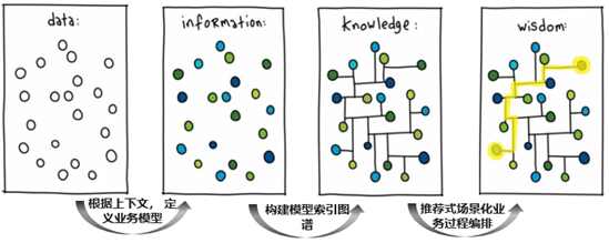 而我们再从业界通用DIKW模型的理解来看,从过不同的视角分析看,构建数字化的过程就是知识累积和场景应用的过程,最终变成从数据->模型->知识->智慧的利用过程。
