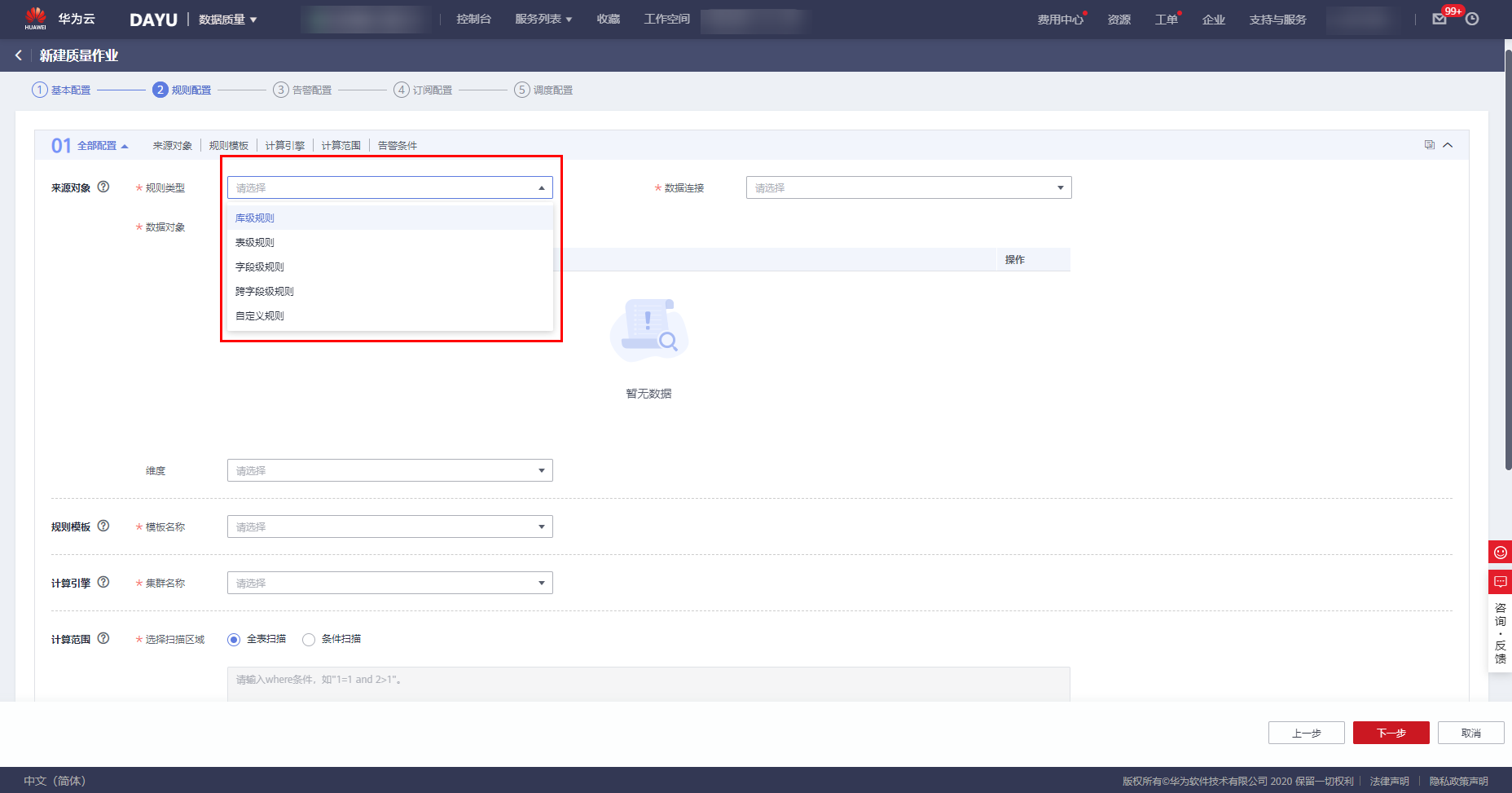 - 进入规则配置步骤后,此处可以配置库级、表级、字段级、跨字段级、自定义五种类型的规则