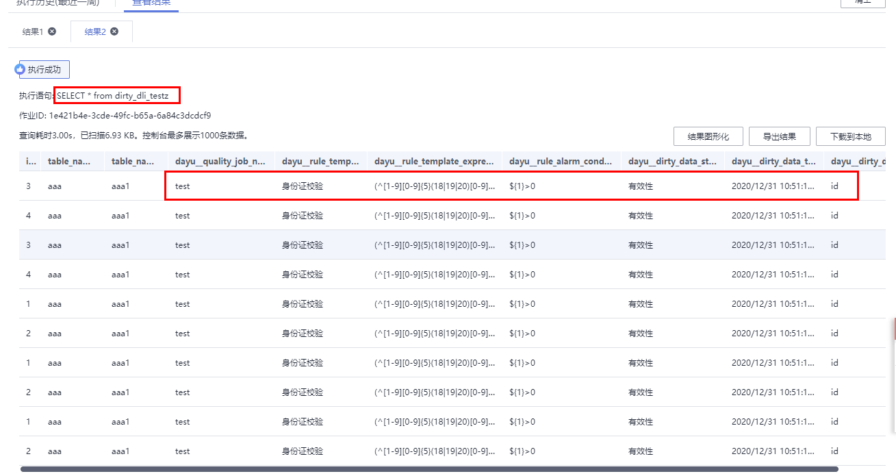 到DLI服务,查询生成的异常表,可以看到不符合数据质量规则的异常数据。