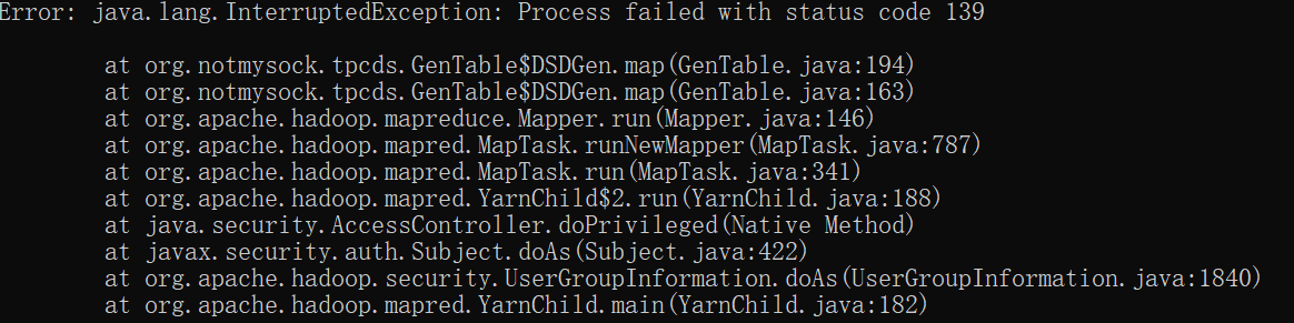首先,我找到报错的第194行,发现是Java Process的waitFor函数报了这个错误,因为hive-testbench生成数据都是依靠tpcds官方工具dsdgen的,因此开始怀疑是dsdgen的调用方式不对或者调用参数由于,但经过打LOG,发现调用命令并没有错误,问题一度陷入了死胡同。