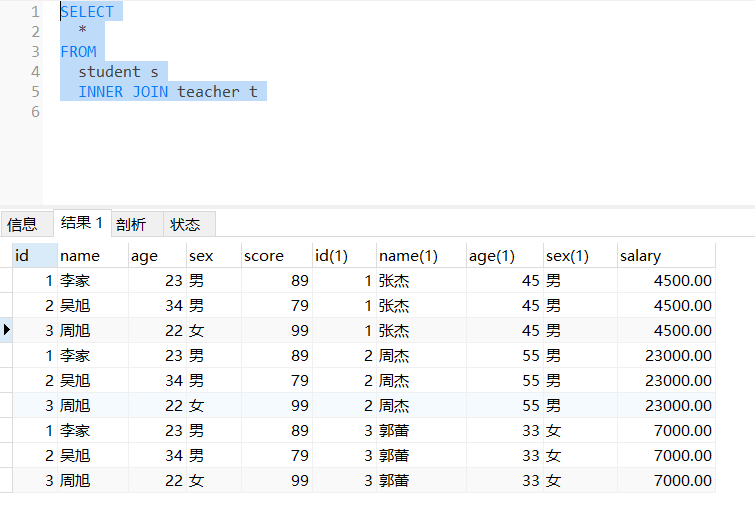 例如:student(id,name,age,sex,score),teacher(id,name,age,sex,salary)