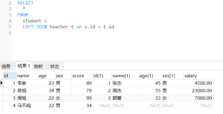 测试语句:SELECT * FROM student s LEFT JOIN teacher t on s.id = t.id