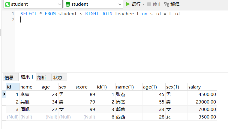 测试语句:SELECT * FROM student s RIght JOIN teacher t on s.id = t.id
