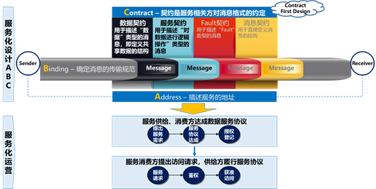 Contract First Design,CFD是一个很朴素的设计理念和方法,既然中台是以服务为中心满足业务协同、共享、自助、感知的需求,那么中台业务应用服务的管理模式就应该与通用的业务服务管理模式一致(与GST的管理模式很类似),即基于契约的服务设计与运营管理。各类业务应用服务的技术实现,本质上是利用通信技术,把计算机里面承载的Bit资源,完整地共享出去,给应用系统瘦身,减少重复投资。这里的Bit资源,包括用于记录业务状态的Data和用于描述业务处理逻辑的Code,需要将Data和Code封装成消息Message再传输。服务供给和消费方要有明确的服务责任边界,并以契约化的方式约定好消息的标准格式。如下图所示,CFD的核心要素包括: