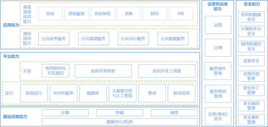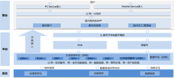 SaaS层协同、共享、自助、感知的业务中台和数据中台需要调用PaaS层技术中台的统一、通用技术服务。有一个趋势,部分原本SaaS层的通用业务应用能力或服务,逐步下沉到PaaS层作为aPaaS(application PaaS)能力或服务,例如工作流引擎、数据视图管理、事务处理、用户和权限管理、邮件和SMS等。