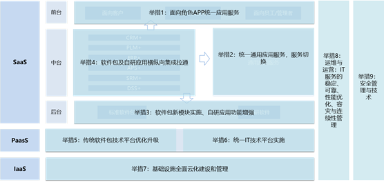 关于IT2.0的架构落地举措,可以参考下图,这是一个协同、共享模式下的前中后台规划的IT架构落地举措示例。按照SaaS、PaaS、IaaS三层,加上运维和运营以及安全两个公共能力,划分整个架构落地举措,明确IT2.0架构落地需要做的事情有哪些。
