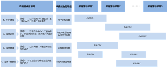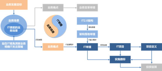 - IT举措源自于业务痛点的IT变革需求,我们需要认识到,要解决一个业务痛点问题,单单只是IT变革是不够的,必须结合业务变革以形成完整的业务解决方案。简单来说,这里的业务变革和IT变革指的就是业务的变化和IT的变化,包括业务政策和流程规则的变化、业务组织的变化、IT系统的变化等等。而IT系统的变化,一方面是要借着业务变化的“东风”,另外一方面需要承接0服务化IT架构落地的相关举措,例如协同、共享、自助、感知模式下的中台架构规划。