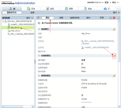 步骤3 找到需要配置的PowerCenter存储库服务,在属性页面找到“存储库属性”,点击修 改,如下图。