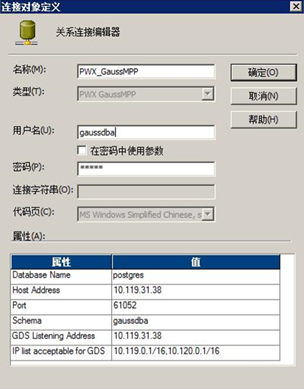 2、单击“新建”,选择PWX GaussMPP,选中确定进入连接对象定义窗口,将跳转至链接配置信息页面