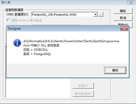 消除以下两处警告;修改D:\Informatica\9.6.1\clients\PowerCenterClient\client\bin\powrmart.ini,在[ODBCDLL]中添加条目:PostgreSQL=extodbc.dll