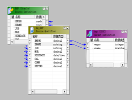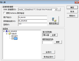 3、配置好数据源后,选择相应ODBC数据源,输入用户名、密码等信息,点击连接,空白窗口显示表信息,选择要导入的源表或目标表