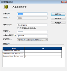 步骤3 workflow中指定目标emp的关系连接编辑器,连接字符串连接为gaussdb,与ini文件中名称一致;