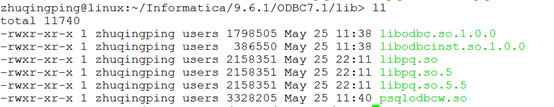 步骤4 将$Informatica_intall/ODBC7.1/lib/备份为$Informatica_intall/ODBC7.1/lib.bak,重新建立$Informatica_intall/9.6.1/ODBC7.1/lib/目录,将unixODBC安装得到的/usr/local/lib/libodbc.so.1.0.0、so.1.0.0及libpq.so拷贝到$Informatica_install/ODBC7.1/lib/目录中,将步骤2解压得到的psqlodbcw.la、psqlodbcw.so拷贝到$Informatica_install/ODBC7.1/lib/目录中。(其实无需备份,直接拷贝到ODBC7.1/lib目录即可)。