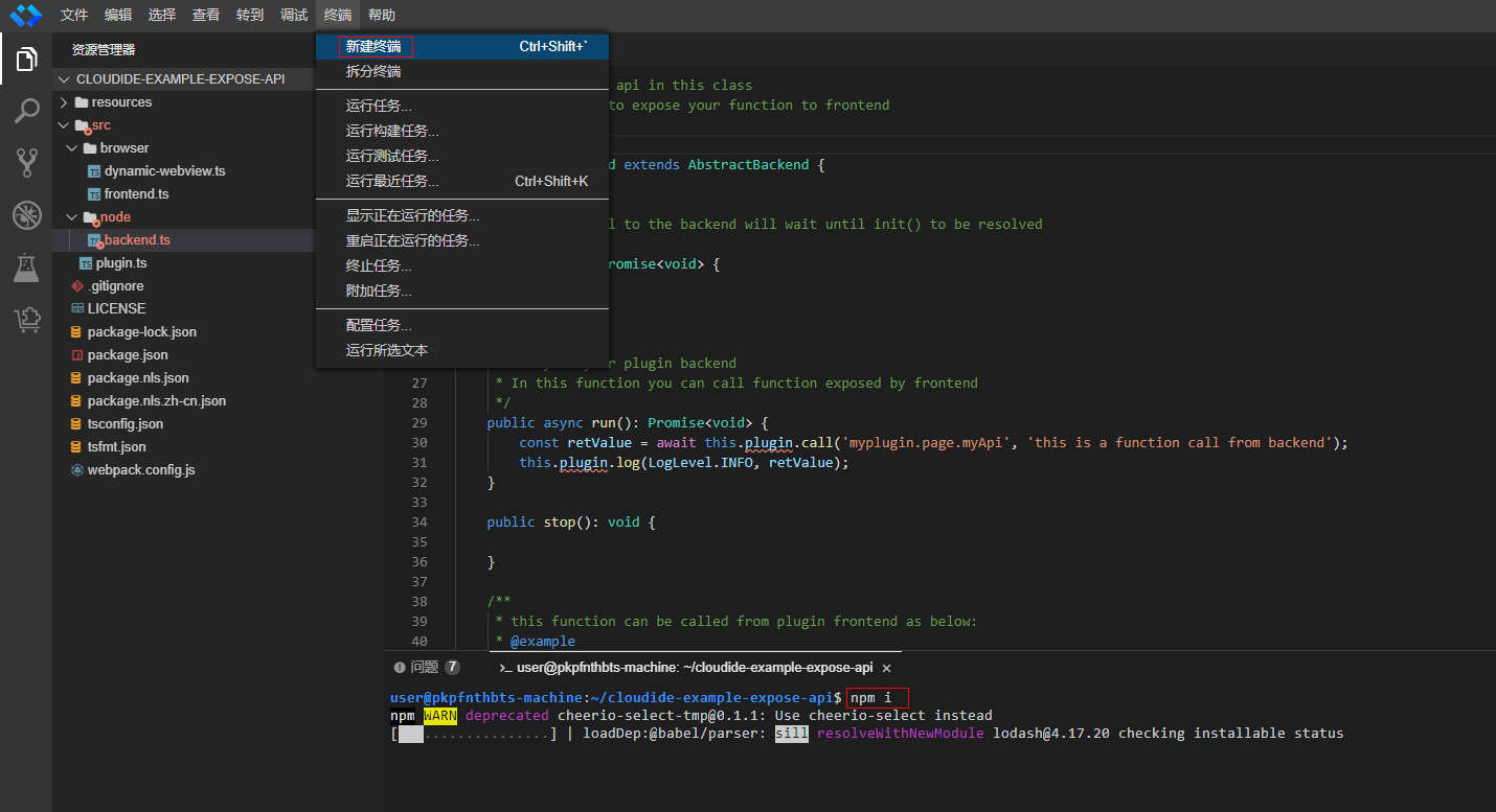 - 本次插件示例代码:https://github.com/HuaweiIDE/cloudide-example-expose-api.git,可以通过文件->导入项目将代码导入到CloudIDE中。