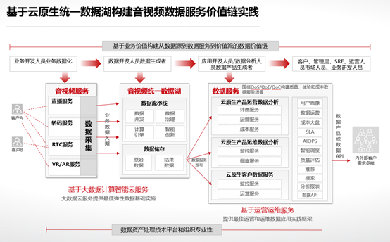 架构落地的具体实践是基于云服务基础设施,首先我们构建了统一的音视频数据湖,同时构建从采集、生产到消费的数据价值链,通过这两者结合,支持所有同时在线的几大类服务接入,和面向内外部七类客户,以及包括运营、运维等客户数据服务的 QoS、QoE、QoC 等三大类七小类的场景诉求。当然仅仅基于这个架构开展体验质量优化工作是远远不够的,这只是技术上的解决方法。
