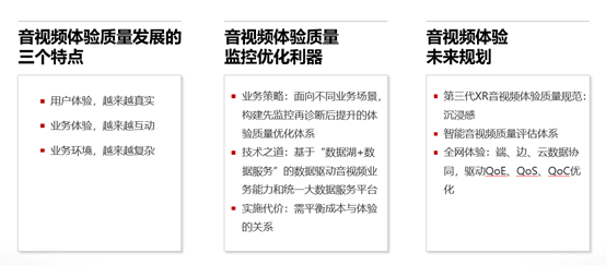 为了保证音视频体验质量,我们有3个利器:第一,针对不同业务场景,构建“先监控再诊断后提升”的体验质量体系;第二,基于“数据湖+数据服务”解决用户差异性和市场不确定性的问题;第三,在实施过程中要平衡成本和体验的关系。