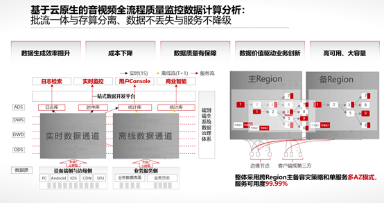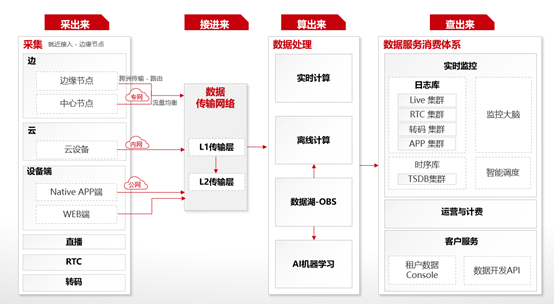 上述介绍的是华为云 RTC 业务体验优化的实践案例,做体验质量优化工作是需要平台完成的,我们下面来分享华为是如何构建音视频服务全流程质量监控平台的。首先从数据采集、传输、计算到消费四个环节的亿级规模音视频质量监控大数据平台,包括支持端、边、云全数据采集和传输的数据网络,支持实时计算、离线计算和机器学习的多模数据处理系统,以及支持运维、运营、客户的数据消费服务体系。