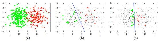 图二:(a)两种类别数据分布图;(b)随机选取数据分布及对应分类器分界线;(c)主动学习挑选最不确定的样本分布[1] 及对应分类器分界线