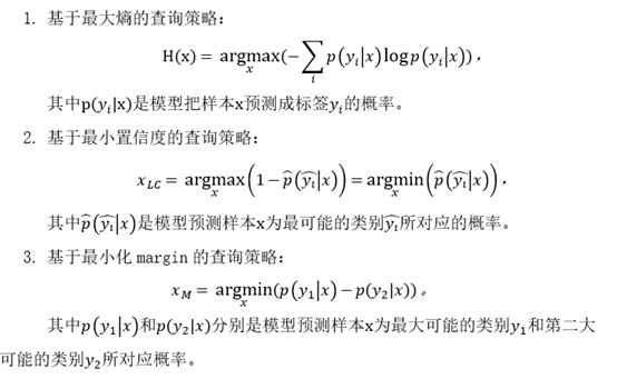 在主动学习中,通常可以选取模型最不确定的样本来进行标注。具体地,我们可以基于最大熵、最小置信度和最小化margin来定量分析样本的不确定性: