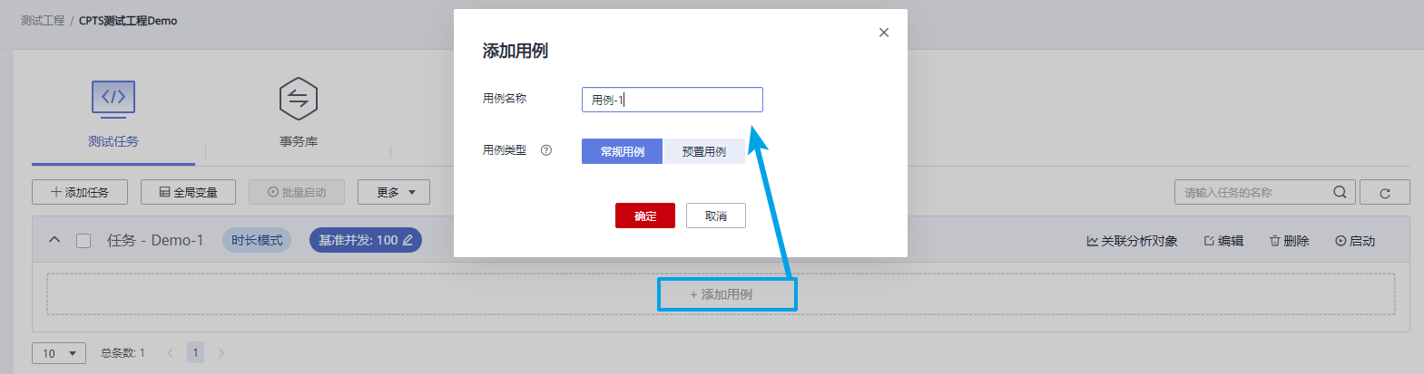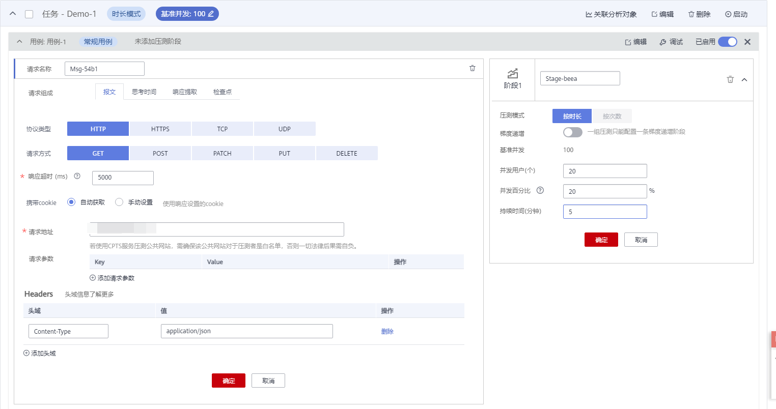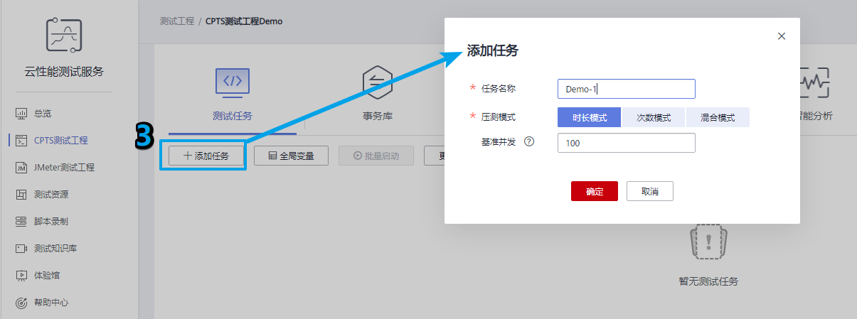 3. 在已经创建的CPTS测试工程中添加任务,具体每个选项的说明参考文档:https://support.huaweicloud.cn/usermanual-cpts/cpts_01_0051.html