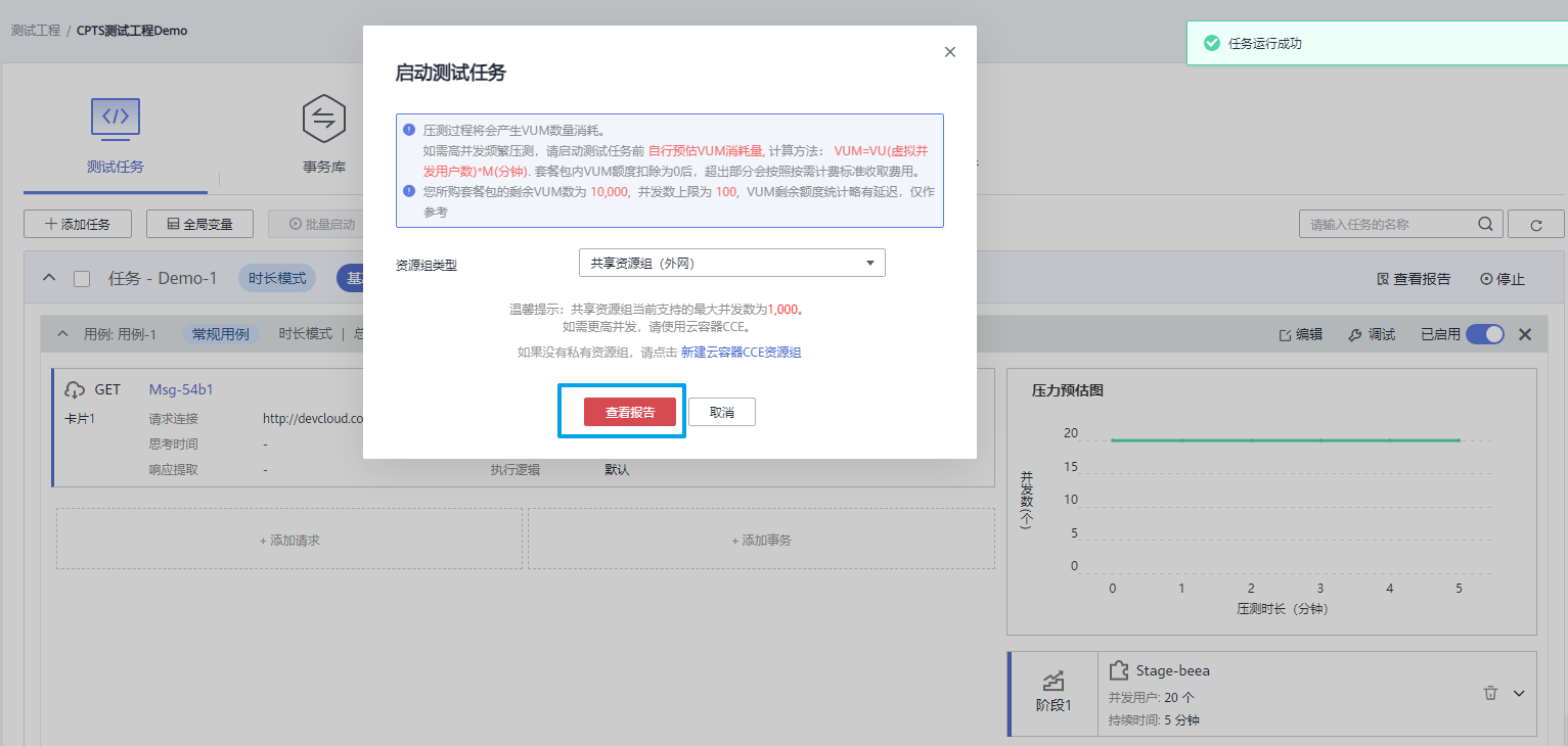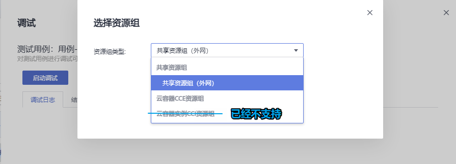 - 调试时可以选择使用“共享资源组(外网)”或是“云容器CCE资源组”;需注意:云容器CCE资源组需要提前去购买并添加到CPTS的测试资源中,具体资源组规格要求请参考文档:https://support.huaweicloud.cn/usermanual-cpts/cpts_01_0008.html