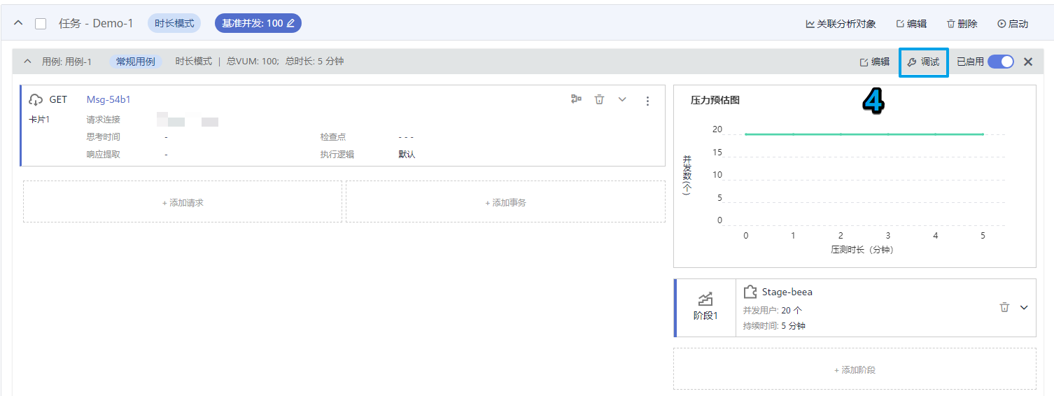 4. 进行调试检查测试用例是否配置正确。若通过调试则可以进行下一步启动测试用例,否则需要检查用例的配置是否正确。