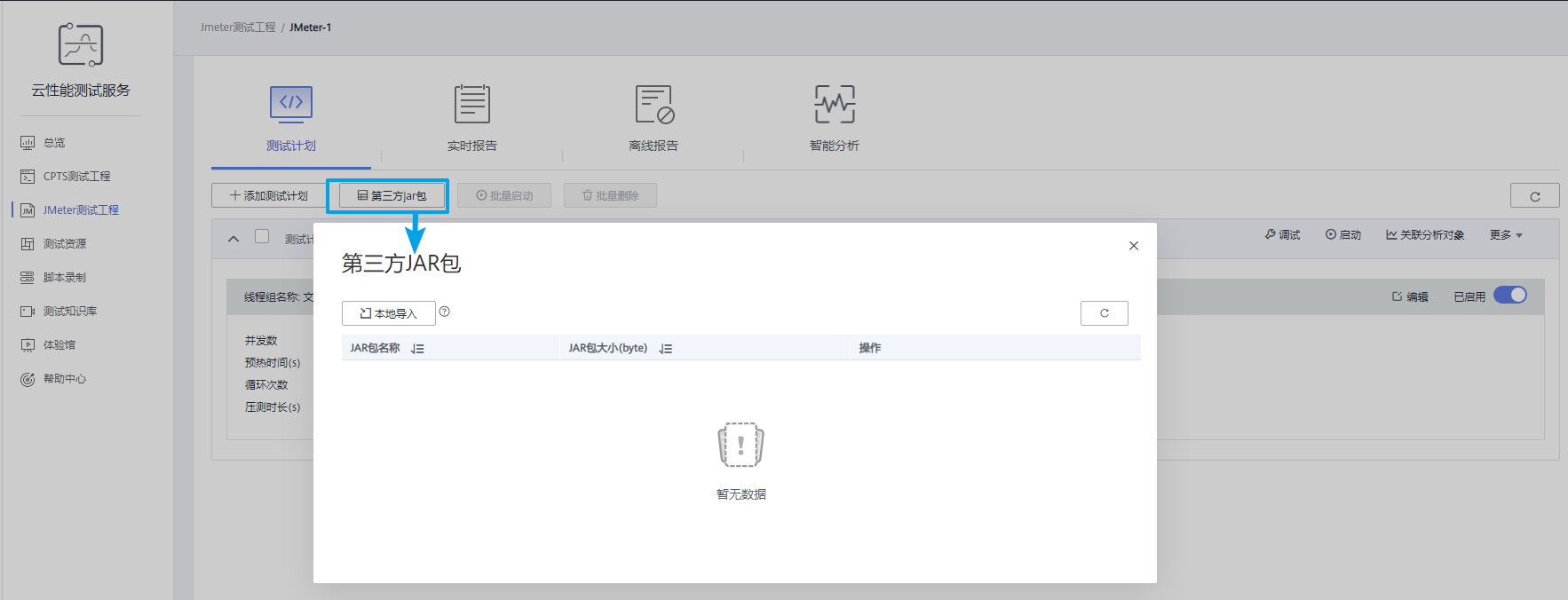 2)添加测试计划,导入*.jmx文件,也可以本地导入第三方jar包。