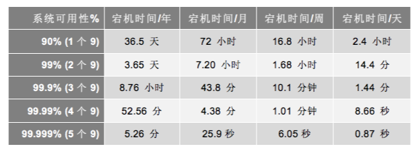 MTTF 是 Mean Time To Failure,指平均故障前的时间,即系统平均能够正常运行多长时间才发生一次故障。系统的可靠性越高,MTTF 越长(简单理解MTTF 就是指系统正常运行的时间)。MTTR 是 Mean Time To Recovery, 平均修复时间,即从故障出现到故障修复的这段时间,也就是系统不可用的时间,这段时间越短越好。系统可用性指标可以用通过下表的999标准衡量,现在普遍要求至少2个9,最好4个9以上: