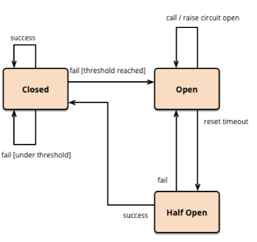 打开(Open)状态:在该状态下,对应用程序的请求会立即返回错误响应或者执行预设的失败降级逻辑,而不调用服务提供方。断路器进入打开状态后会启动超时计时器,在计时器到达后,断路器进入半开状态。 -