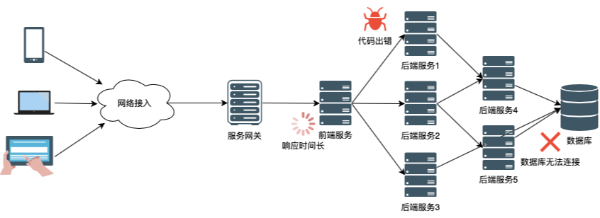 如上图的分布式系统中,用户请求系统中的某个服务接口,请求需要经过长长的调用链才能处理返回。我们起码要保证网络连接正常,服务网关正常、前端服务正常、后台服务正常、数据库正常,请求才能被正常处理,如果调用链中的任一环节出现问题,都会直接反馈到用户体验上。
