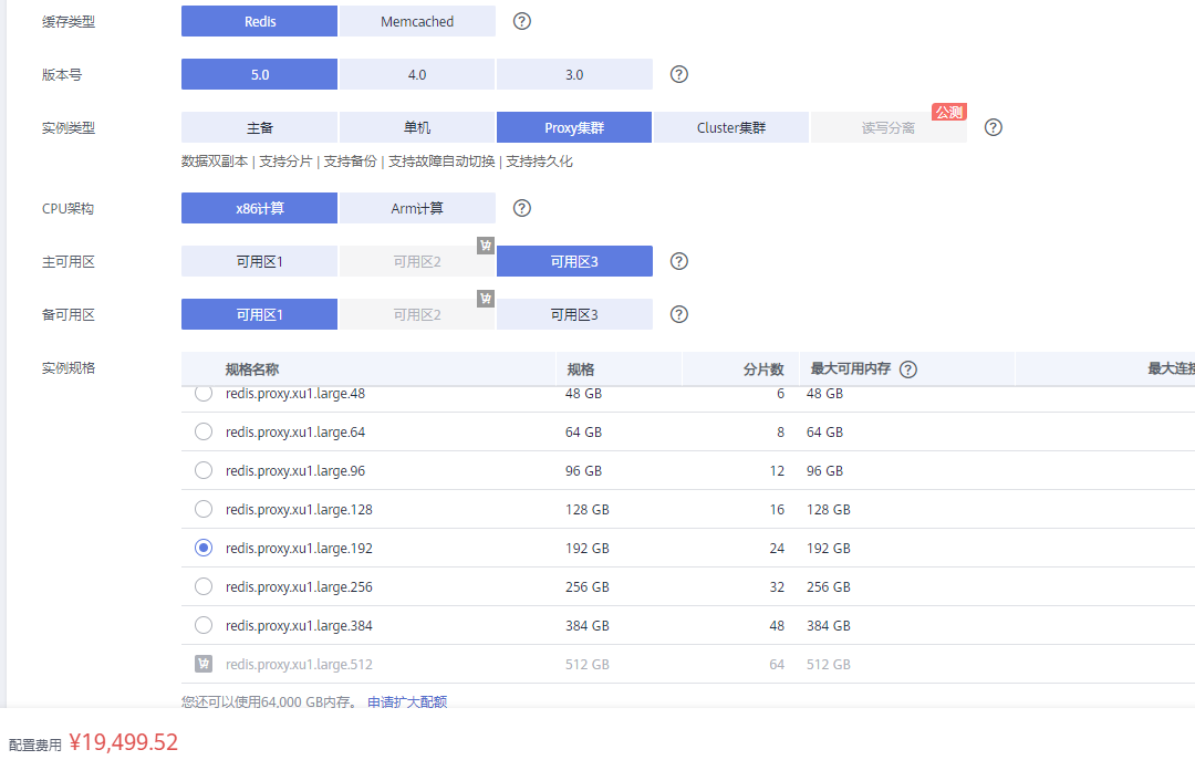 因为高斯 Redis最小实例的容量是48G,因此购买对标的原生Redis实例,为64G主从规格(实际可用内存“号称51.2G”)。