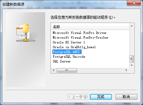 选择PostgreSQL ANSI或者Unicode,点击“完成”安装。