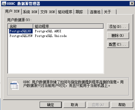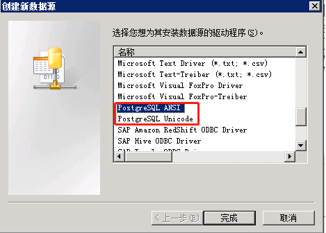 - 选择添加,安装ODBC安装包后,会出现如下PostgreSQL ANSI和PostgreSQL Unicode(两个都安装一下):