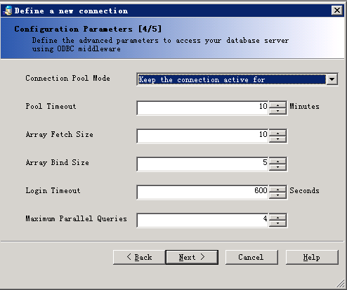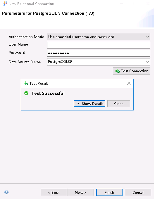 - 输入User Name、Password和Data Source Name(此处填写ODBC数据源名称),点击”Test Connection”,验证连接成功后,点击“Finish”