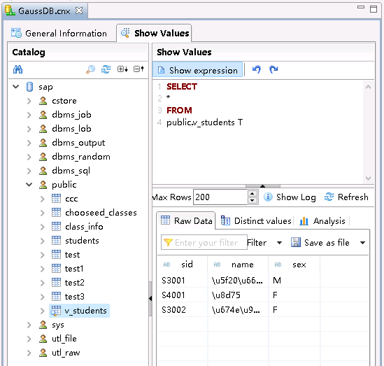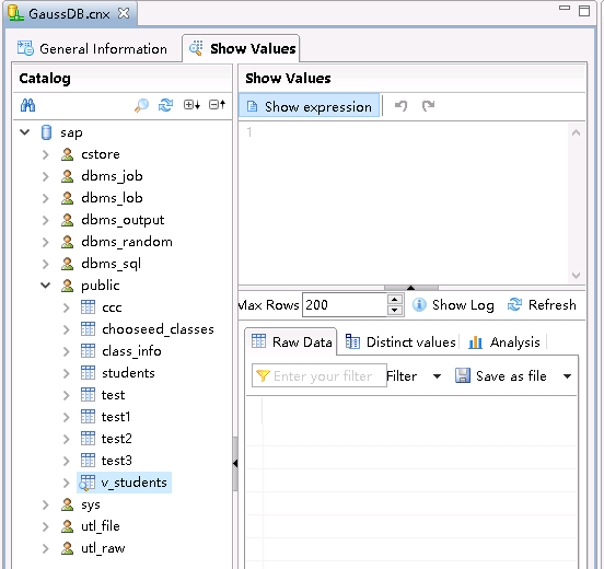 - 展开左侧“数据库对象树”,可以查看GaussDB的表和视图