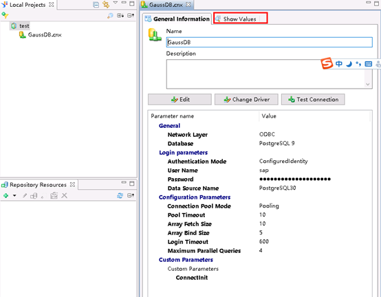 - 建好后,在数据库连接窗口中,选择Show Values子窗口